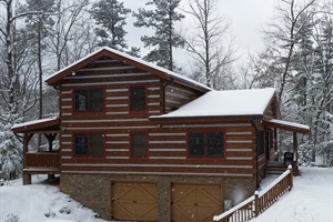 Appalachian Escape Cabin combines traditional and modern elements, with hand-hewn hemlock log walls, exposed beams, gleaming hardwood floors, and rustic log furniture. Pine cone motif light fixtures accentuate the all-log interior.